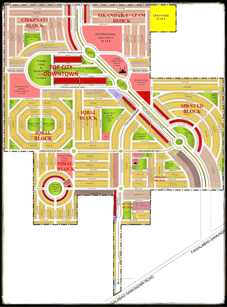 Top City Faisalabad is a sprawling housing project spanning approximately 137 acres, offering a diverse mix of residential and commercial spaces. The layout of Top City is carefully planned out on the top city map, with thoughtfully designed streets, parks, and community areas to foster a sense of connection and community among residents. The project boasts modern amenities such as shopping centers, schools, mosques, and recreational facilities to cater to the needs of its residents. With its prime location in Faisalabad and easy accessibility to major roads and public transportation, Top City offers convenience and comfort for its inhabitants. Whether you’re looking for a cozy residential space or a bustling commercial area, Top City has something for everyone to enjoy in this vibrant urban environment.